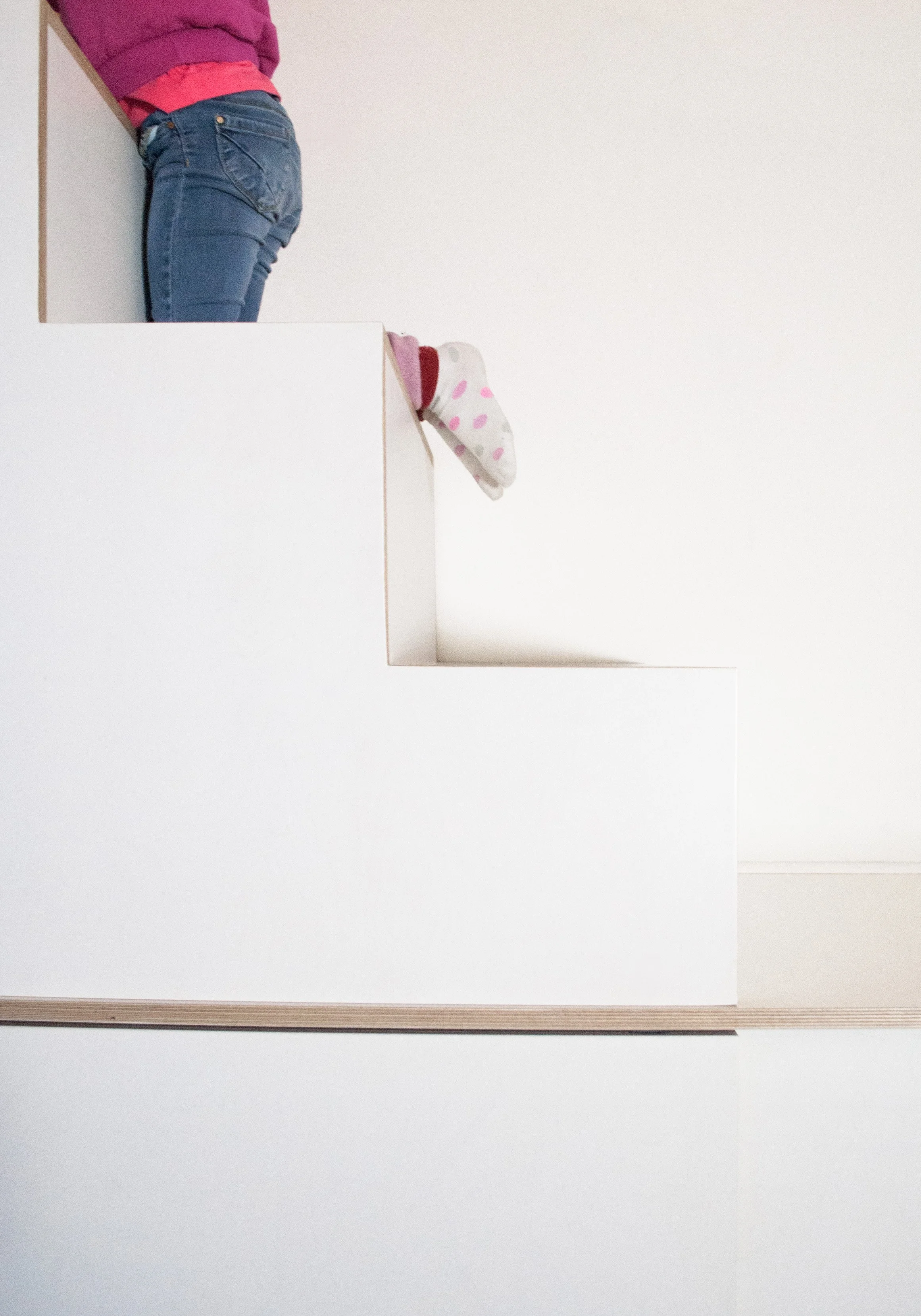 HOC Spielen und schlafen auf mehreren Ebenen. Für ein Kinderschlafzimmer in einer Gründerzeitwohnung wurde eine Hochebene geplant, die sich an die unterschiedlichen Bedürfnisse der insgesamt drei Kinder anpasst und Spaß macht. Entstanden ist eine Landschaft mit mehreren Verstecken, Ruhe- sowie Spielzonen und ausreichend Stauraum für Spielzeug der Kinder.